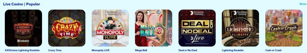 Kolmen alaluokan suosituimpia pelejä ovat; Lightning Roulette, Mega Ball, Crazy Time, XXXtreme Lightning Roulette, Monopoly LIVE, Deal or No Deal ja 18 muuta.